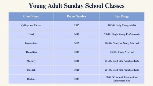 We accomplish these things primarily through our young adult Sunday School Groups where friendships can grow. These groups meet along the south hallway of our church building. Each group has a team of great leaders, and there is a group for you no matter your background. Sunday School Groups meet at 9:00 a.m.